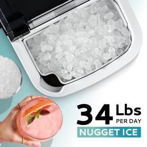 Quickly quench your thirst with the powerful EUHOMY Flake Ice Maker! Enjoy fresh, sonic ice and chilled drinks in 6 to 8 minutes. With a 1.2-quart water tank, this machine can produce up to 34 pounds of ice per day and features a removable 1.8-pound basket. The unique, soft, crunchy ice cubes won’t hurt your hands or mouth and help cool drinks quickly while preserving their flavor. It provides a fun, chewy experience, perfect for iced coffee, smoothies, and ice-crunching snacks.