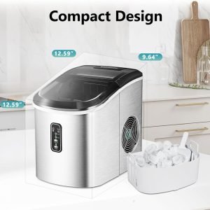 Our flake ice maker features a sturdy handle, a compact size (length x width x height) of 9.45 x 11.61 x 12.99 inches, and is lightweight. These features make our pellet ice maker highly portable and perfect for any occasion, including home, office, camping, parties, bars, or RVs. Another user-friendly design is the rear ice scoop for easy storage when not in use. A large window allows for direct monitoring of the ice-making process. Buy now and enjoy refreshing drinks all summer long!